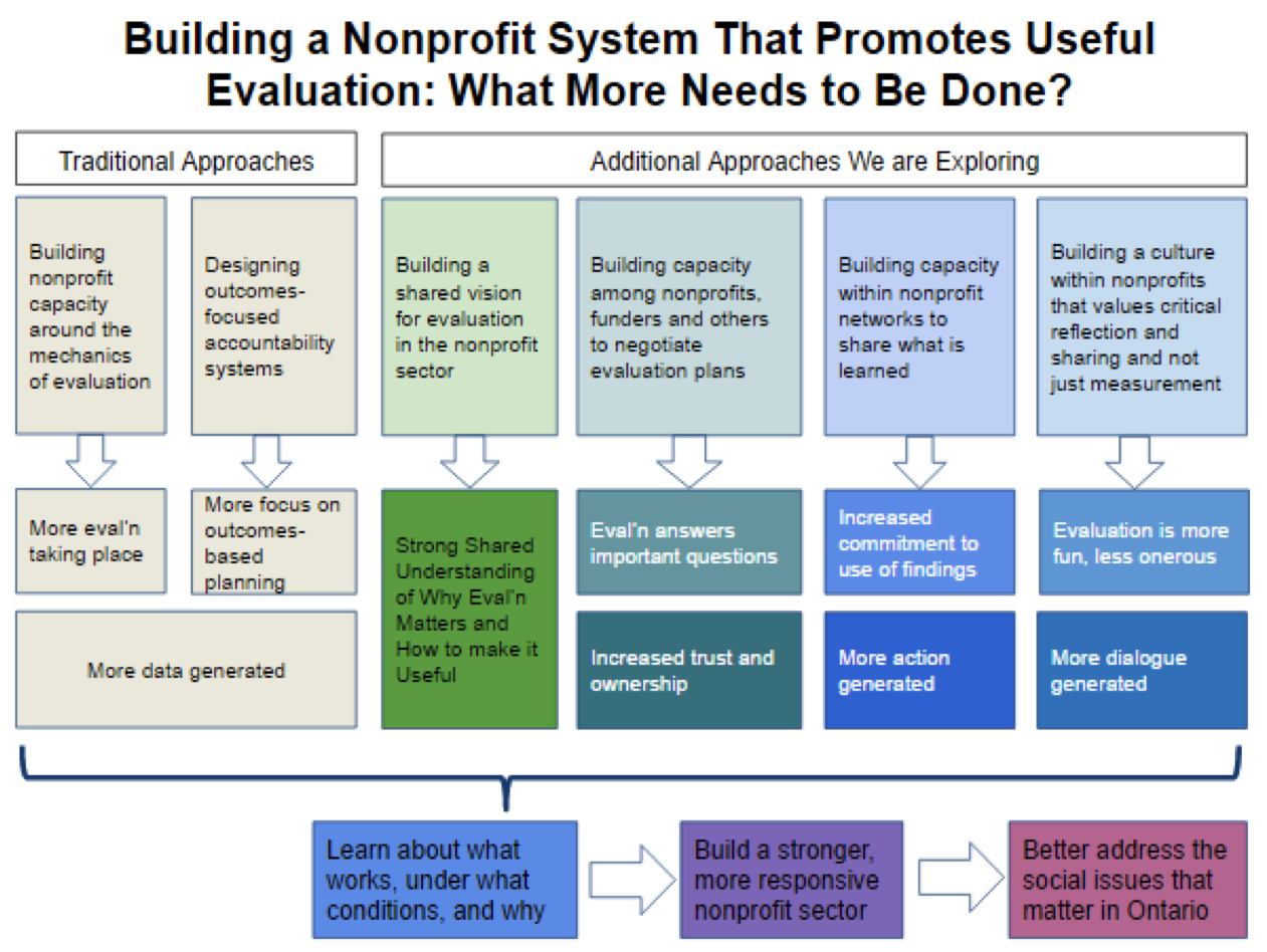 Ontario nonprofit leaders are under a lot of pressure to evaluate their work. Although they appreciate the potential of evaluation, they often tell us that they find the process frustrating and stressful in practice. We set out to try to understand this frustration by speaking with nonprofits, funders, government reps, and evaluators from around the province. It turns out that the reasons are actually pretty clear and consistent with what research on evaluation utilization would predict. When nonprofits get frustrated with evaluation, it is because they haven’t had input into the design, the questions aren’t meaningful to them, communication is insufficient or vague, and they don’t know who will use the findings or whether they will even get read.