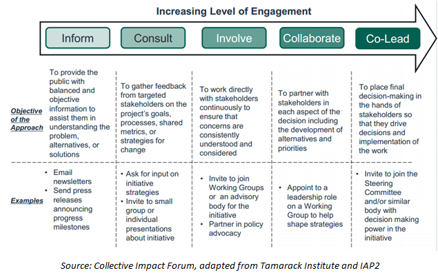 While the specific strategies for working with community members are dependent on each collective impact initiative’s local context, we believe that collective impact initiatives should have ambitions to engage community members at least at the level of “involve” on the IAP2/Collective Impact Forum spectrum referenced above. As the collective impact initiative evolves, leaders should continue to assess how they can move their work towards the “co-design” level on the CIF/IAP2 spectrum where possible to ensure that their efforts are truly inclusive of community members.